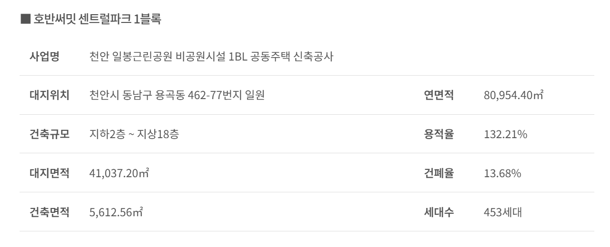 1BL은 약 450세대, 2BL은 약 1,280세대로 구성되어 있으며, 총 연면적 약 8만㎡에 달하는 대단지입니다. 천안 도심 내에서도 대형 근린공원과 연계되는 주거공간으로 주목받고 있습니다.